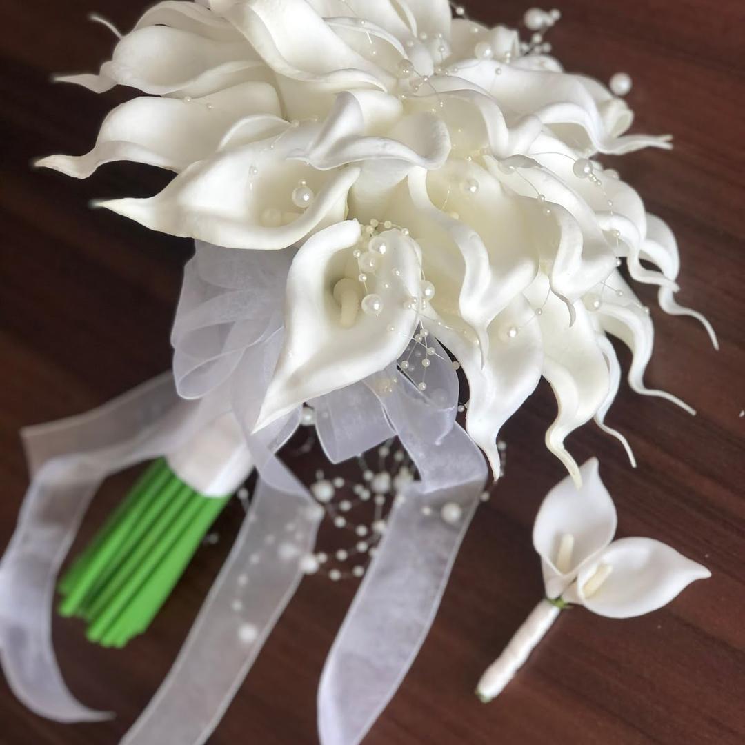 • تصميم أنيق يجمع بين الزهور البيضاء واللؤلؤ اللامع